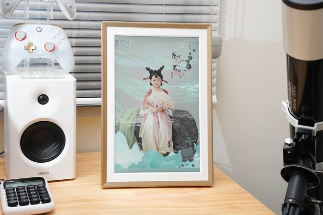 在没有通电的时候它其实和我们家中的普通相框没啥区别,不同点在于它采用了香槟金色的金属边框,有金属质感的同时,香槟金的配色也非常高级,能够完美融入现在的家居装修风格中。