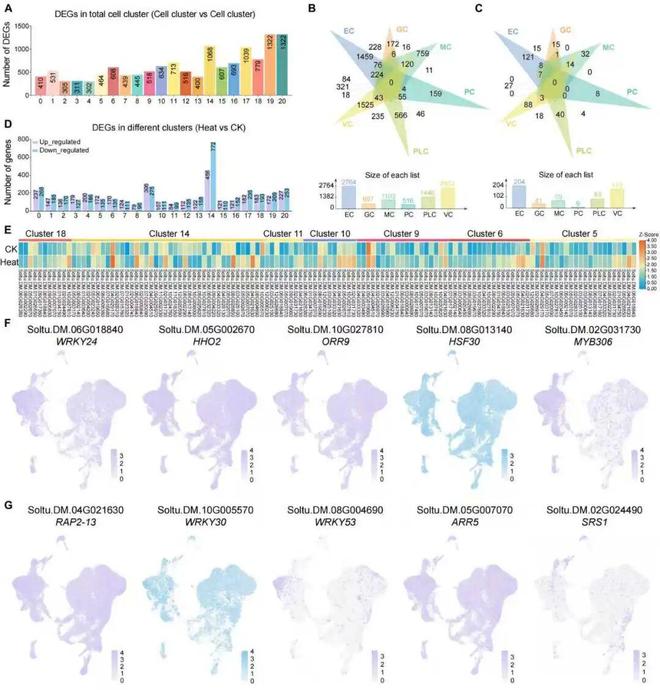 种创中心马铃薯团队的吕典秋教授带队选择了另一个研究方向。他们利用单细胞转录组测序技术,对超过77,000个马铃薯叶片细胞进行个体体检,精确识别出了21个细胞簇,归属为6种主要细胞类型。